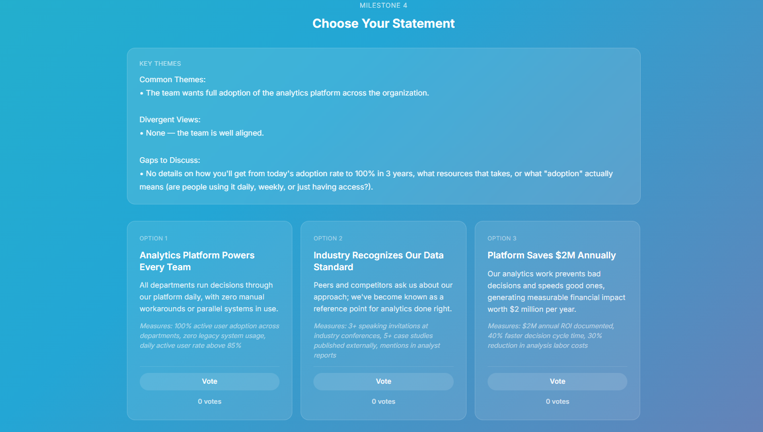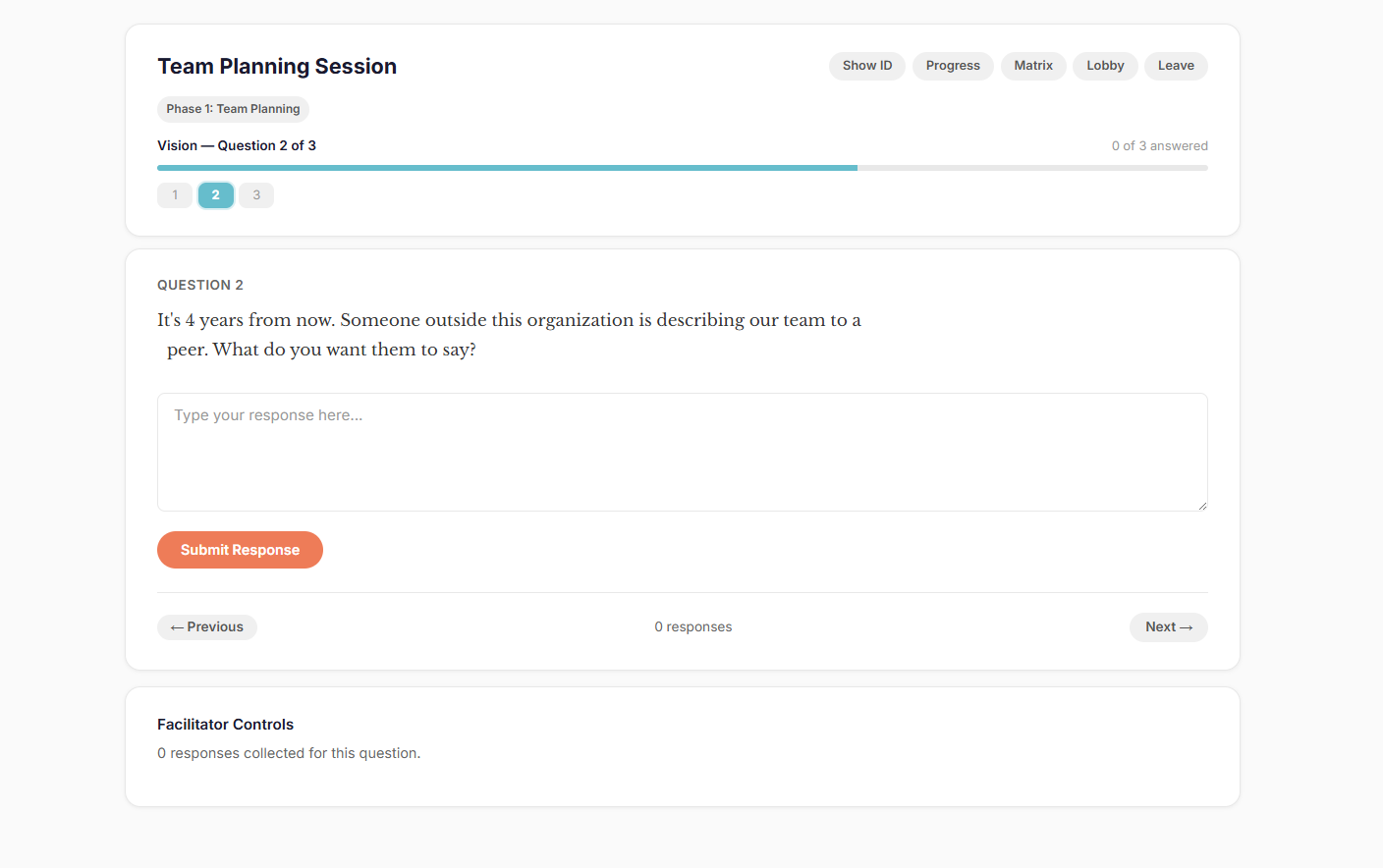 I searched broadly. Planning tools. Facilitation platforms. Survey tools. Workshop software. I could have stitched together three different products and gotten maybe 60% of what I needed. The remaining 40% I'd have to figure out on the fly.